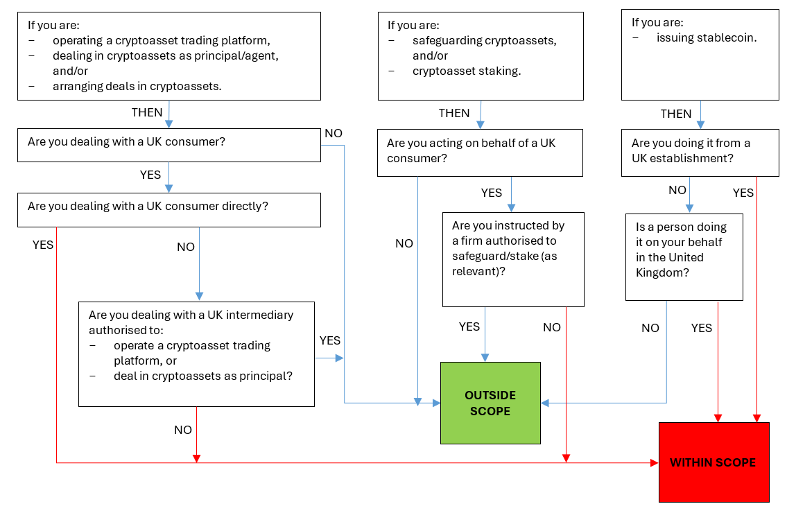 Note: Overseas cryptoasset firms whose operations have UK elements will need to assess if they could fall within scope, particularly where they service consumers in the United Kingdom. There may also be some impact for traditional businesses whose activities involve cryptoassets (e.g. firms providing custody services for tokenised securities that are within scope of the new cryptoassets regime) given the different rules on territoriality for cryptoassets.